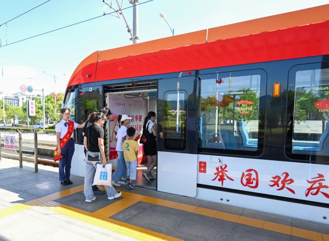 “10月1日到7日,乘客可免費(fèi)乘坐武夷山有軌電車,其中兩輛以‘輝煌中國·共筑夢想’為主題的列車,分別采用紅色和金色為主色調(diào),車內(nèi)裝飾融入‘中國風(fēng)’和國慶元素,并設(shè)置了非遺體驗(yàn)區(qū),1日至3日游客乘車時(shí)可體驗(yàn)?zāi)掀椒沁z文化?!备=掀轿湟挠熊夒娷囉邢薰緺I銷策劃部客運(yùn)營銷管理鄭昌烘介紹,公司在南源嶺站點(diǎn)設(shè)置了導(dǎo)覽指示牌,乘客下車后可步行至崇陽溪漫游道進(jìn)行游覽。