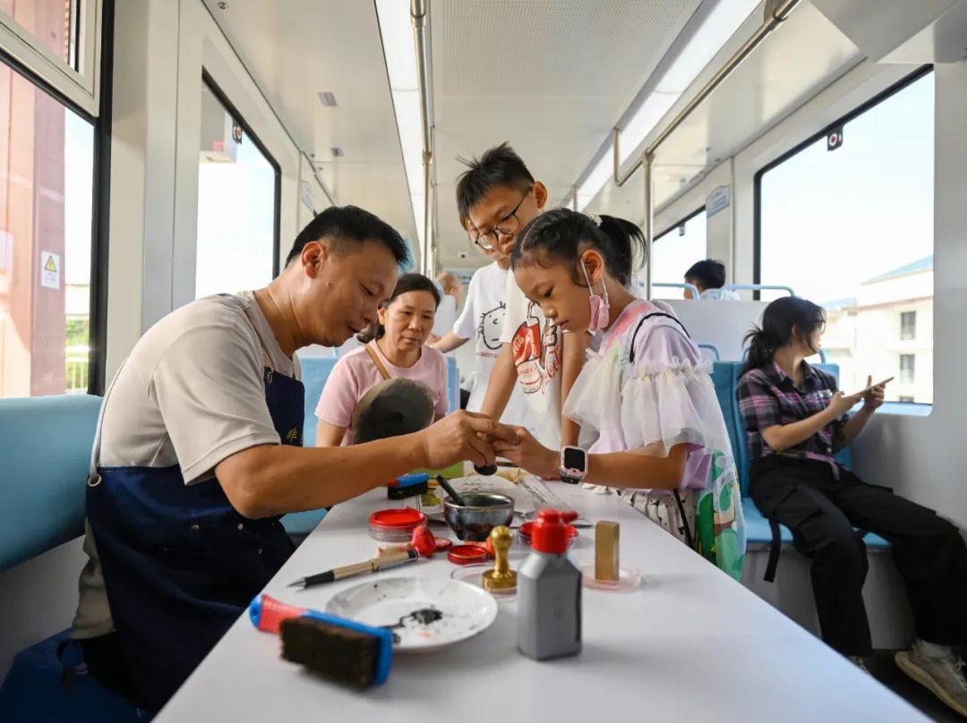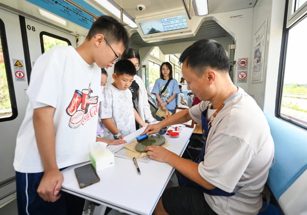 “在九曲溪乘坐竹筏能看到各類摩崖石刻,在這里我們試著拓印下一些摩崖石刻,感受武夷山的文化。”10月1日上午,武夷有軌電車上,福建南平武夷有軌電車有限公司邀請非遺技藝傳承人引導(dǎo)游客體驗(yàn)?zāi)掀椒沁z文化,武夷摩崖石刻修復(fù)技藝非遺傳承人林思帶領(lǐng)著列車上的小朋友體驗(yàn)拓印摩崖石刻。