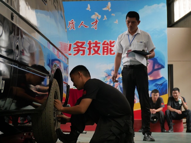 1日,第六屆南平市武裝押運(yùn)崗位業(yè)務(wù)技能競賽在延舉行。此次競賽由福建省國資保安守押有限公司、南平市人力資源和社會(huì)保障局、南平市總工會(huì)聯(lián)合舉辦,來自各縣(市、區(qū))押運(yùn)大隊(duì)32名隊(duì)員同臺(tái)競技,一展身手。圖為參賽選手進(jìn)行快速拆裝輪胎項(xiàng)目。 (張俁辰 攝)