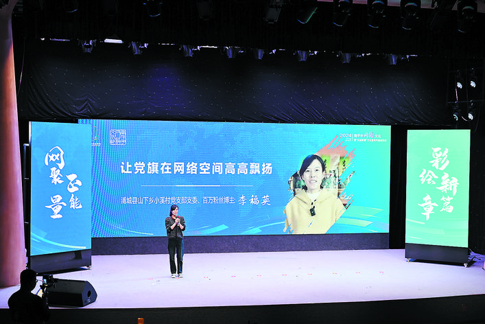 在2024年南平市網(wǎng)絡(luò)文化暨“公益彩票”文化宣傳月啟動(dòng)儀式上,“到南平去助鄉(xiāng)村興”網(wǎng)絡(luò)名人代表李福英講述發(fā)揮黨員先鋒模范作用,為農(nóng)戶直播銷售土特產(chǎn)的故事。 (張莎 攝)