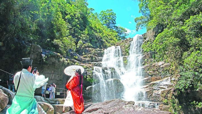 “網(wǎng)絡(luò)名人看武夷”活動(dòng)中,網(wǎng)絡(luò)達(dá)人們正在武夷山青龍大瀑布前取景拍攝。 (林李冰 攝)