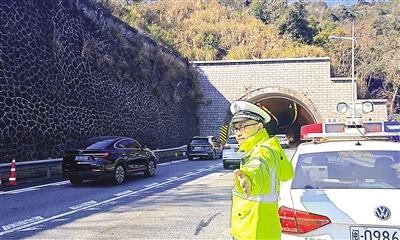 春運(yùn)開啟,浦武高速、寧光高速車流量增加,南平高速交警支隊(duì)四大隊(duì)科學(xué)部署警力,在多個(gè)收費(fèi)站值守,定點(diǎn)預(yù)警,保障車輛有序通行。圖為民警在浦武高速(上行)鷹山隧道入口值守。 (盧國(guó)華 譚逸群 攝)