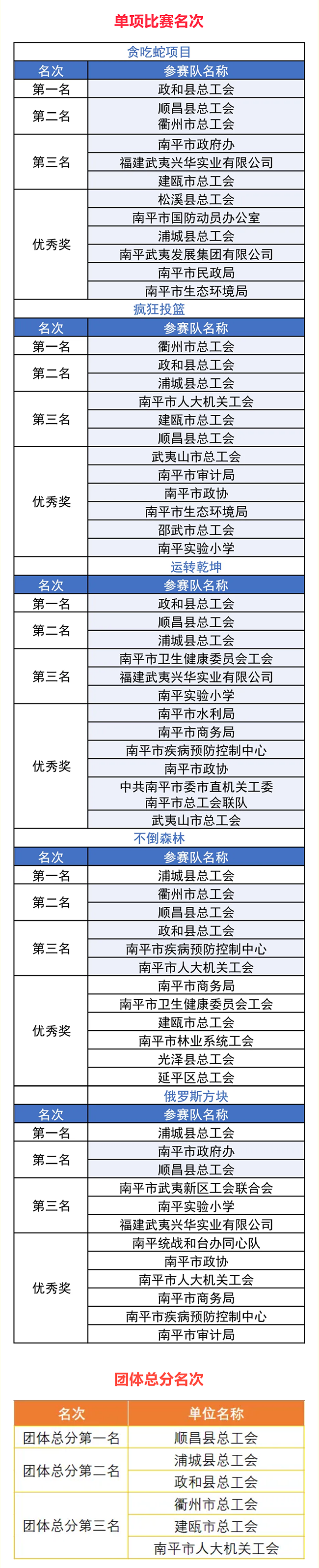 經(jīng)過一天緊張激烈又趣味橫生的角逐,最終決出單項(xiàng)獎(jiǎng)第一名5個(gè)、第二名10個(gè)、第三名15個(gè)、優(yōu)秀獎(jiǎng)30個(gè)。獲得團(tuán)體總分獎(jiǎng)的隊(duì)伍則分別是:第一名順昌縣總工會(huì);第二名浦城縣總工會(huì)、政和縣總工會(huì);第三名衢州市總工會(huì)、建甌市總工會(huì)、南平市人大常委會(huì)機(jī)關(guān)工會(huì)。賽事全程進(jìn)行照片直播,累計(jì)觀看人次近13萬。