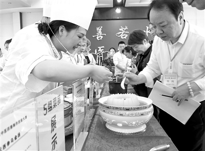 隨著香味四溢,一道道經(jīng)過精心擺盤的藥膳端上了餐桌?!皼霭枭剿幗z不錯,很爽口。”“香櫞佛手粥挺特別的,絲絲甜味中有中藥的清苦味?!薄斑@道鴿子湯很鮮甜?!爆F(xiàn)場評委邊看邊品,從衛(wèi)生、營養(yǎng)、味道、品名、新穎、推廣等多個角度對參賽膳品進行評估。