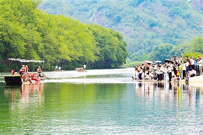 5月31日,武夷山市竹筏工在九曲溪“洗河”。端午節(jié)“洗河”,是武夷山獨(dú)特的傳統(tǒng)習(xí)俗之一。每年這個(gè)時(shí)候,當(dāng)?shù)胤すざ紩?huì)劃著懸掛彩旗的竹筏,沿九曲溪而下,同時(shí)撒下大米、茶葉、熟芝麻、鹽巴等,祈求一年平安幸福。 (邱汝泉 攝)