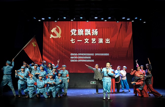6月28日,“黨旗飄揚‘七一’文藝演出”在南平市大劇院舉行。此次活動由南平市委市直機(jī)關(guān)工委和南平市文旅局指導(dǎo),南平市文化藝術(shù)館主辦?;顒又?,南平市云谷銀光藝術(shù)團(tuán)帶來男聲小組唱《當(dāng)這一天來臨》、薩克斯演奏《黨啊!親愛的媽媽》、合唱《沒有共產(chǎn)黨就沒有新中國》等精彩節(jié)目,慶祝中國共產(chǎn)黨成立104周年,彰顯南平市群眾文化活力。圖為情景劇《天下鄉(xiāng)親》。 (劉昕宇 羅光耀 攝)