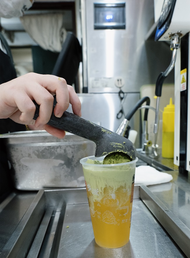 茶飲店內(nèi),店員往杯中加入冰激凌。