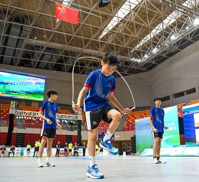 4日,由全國青少年體育聯(lián)合會、福建省體育局、南平市人民政府主辦的2025年國際青少年跳繩公開賽暨第二屆中國城市青少年跳繩公開賽—總決賽在南平市體育中心開賽,來自7個國家和地區(qū)的近500名選手參加比賽。圖為4×30秒單搖接力比賽現(xiàn)場。(張行健 攝)