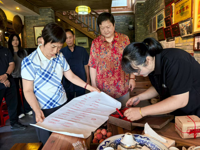 7月3日,武夷茶莊“瑤珍號”傳承人劉芳(右一)向南平市政協(xié)課題組展示商號印章。