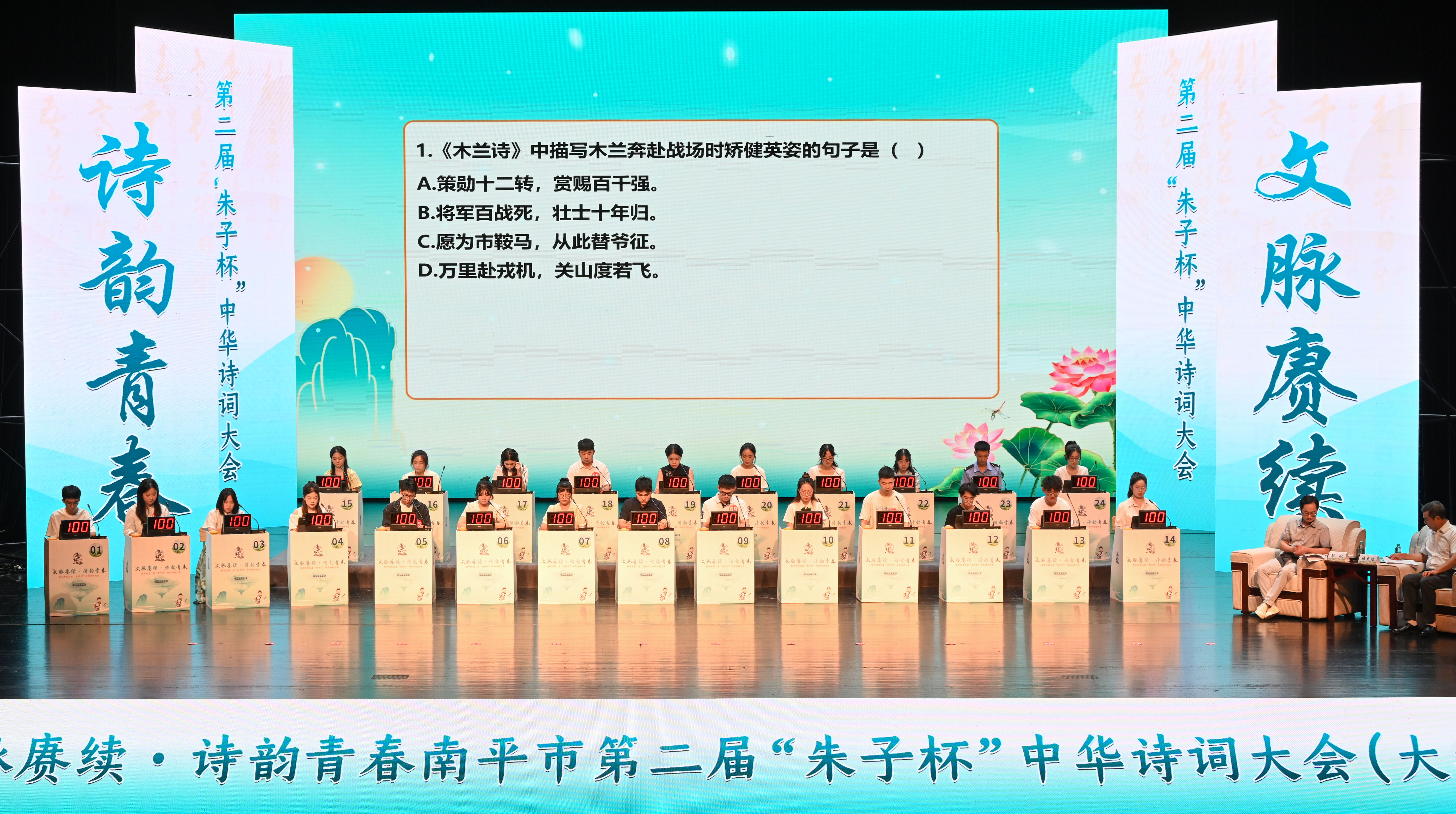 本次比賽由南平市教育局、中華文明武夷研究院、南平市朱子文化傳承發(fā)展中心、共青團南平市委員會、福建武夷旅游集團、中華文明兩岸高端學(xué)術(shù)研學(xué)坊聯(lián)盟聯(lián)合舉辦,設(shè)“山河入卷·詩境尋蹤”必答題、“風(fēng)云際會·詩心鏖戰(zhàn)”搶答題及“詩脈縱橫·妙語連珠”即興演講三個環(huán)節(jié),對選手們的詩詞積累、文學(xué)素養(yǎng)及臨場發(fā)揮能力提出挑戰(zhàn)。