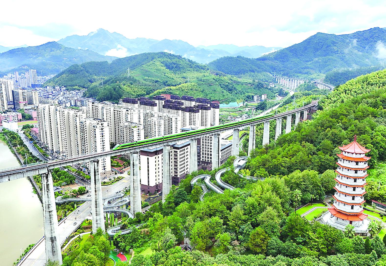 9月24日,“綠巨人”新型動(dòng)車通過衢寧鐵路政和熊城特大橋(無人機(jī)照片)。