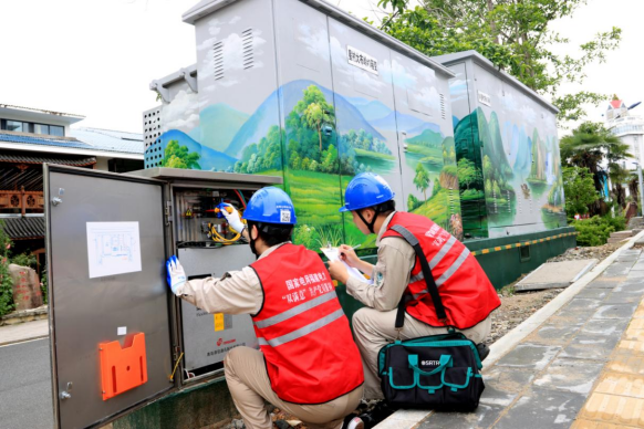 “電特派”團(tuán)隊成員在武夷山星村鎮(zhèn)巡視設(shè)備,保障景區(qū)酒店及茶企用電可靠