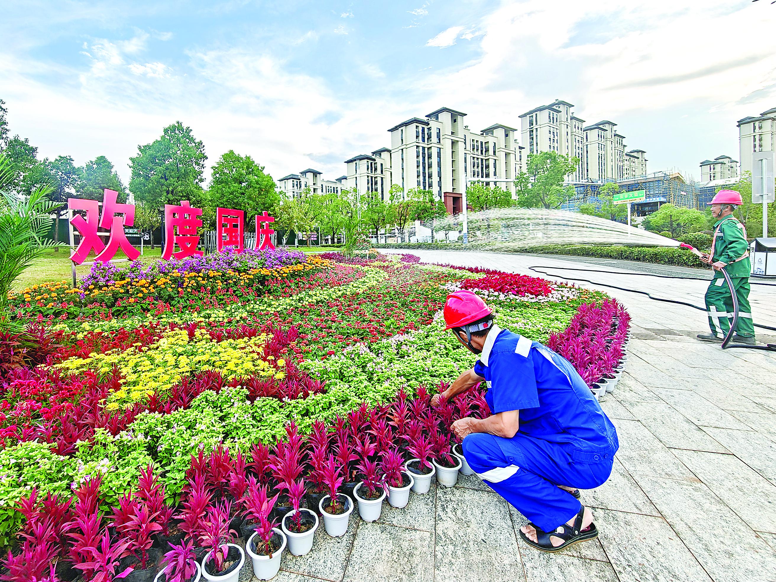 國慶節(jié)臨近,我市各地通過懸掛國旗、布置主題花壇、舉辦文化活動等形式營造節(jié)日氛圍,彰顯愛國熱情。圖為武夷新區(qū)一主題花壇,工人正在進行養(yǎng)護。(朱宇 盧國華 攝)