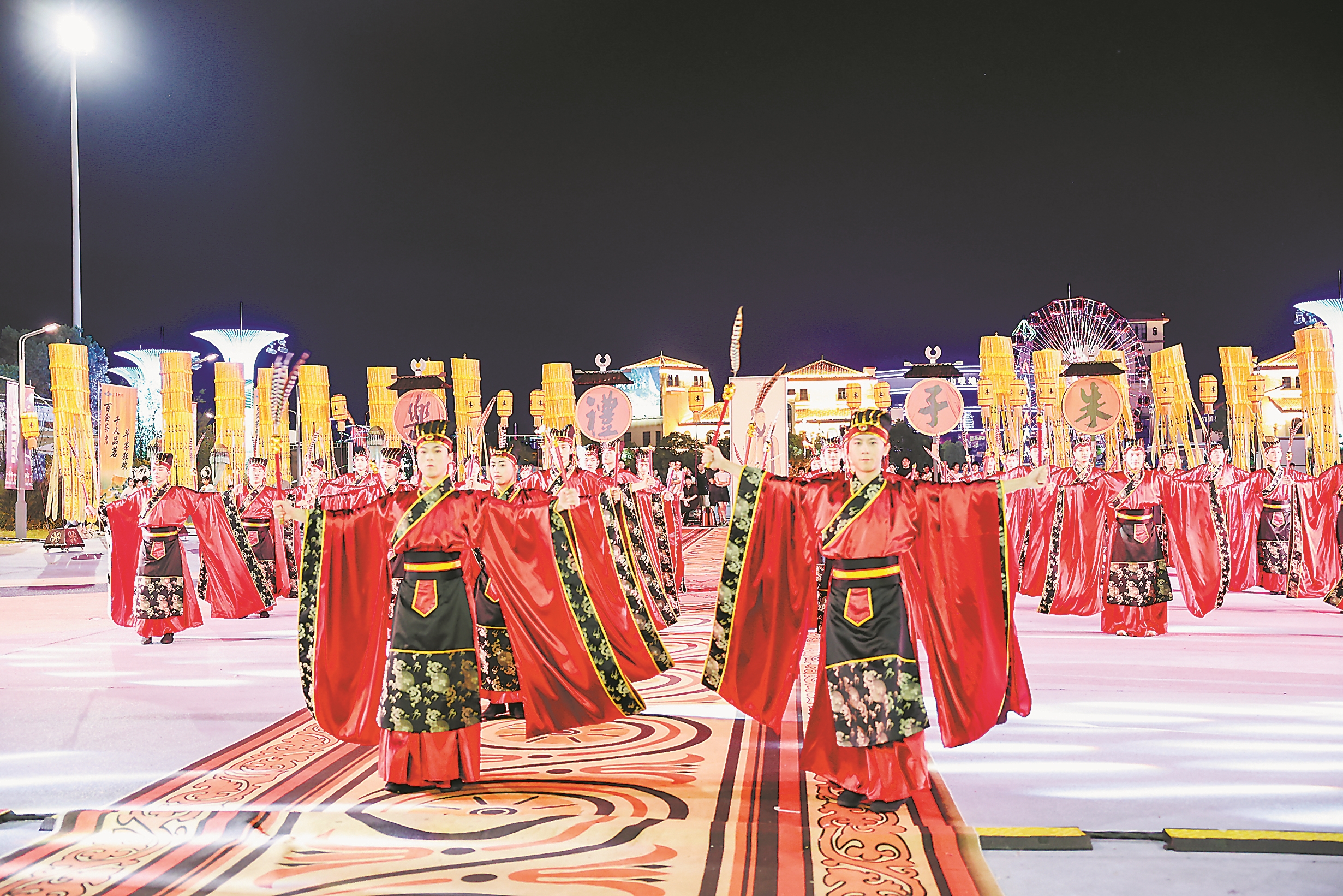 國慶中秋假期,以朱熹的人生軌跡和思想脈絡(luò)為主線的大型文旅山水史詩《月映武夷》開演前,演員們在月映武夷劇場前的武夷山市武夷廣場上,為游客奉上朱子禮樂大典表演。朱子禮樂大典于今年8月底啟幕,通過廣場秀的形式,將朱子文化變得可觸可感、可親可近。李茜 攝