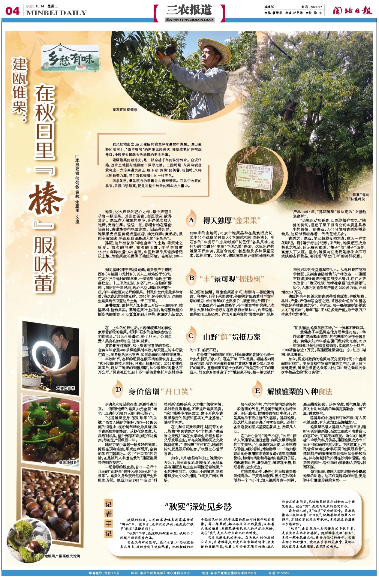 “秋實(shí)”,是自然與人共同譜寫的豐收樂章,是實(shí)實(shí)在在的豐收喜悅。建甌錐栗這顆“秋實(shí)”,更是一顆承載著文化、情感與記憶的種子。它藏在游子的行囊里,綻放在鄉(xiāng)親的笑顏中,最終沉淀為這片土地最溫暖、最深厚的底色。