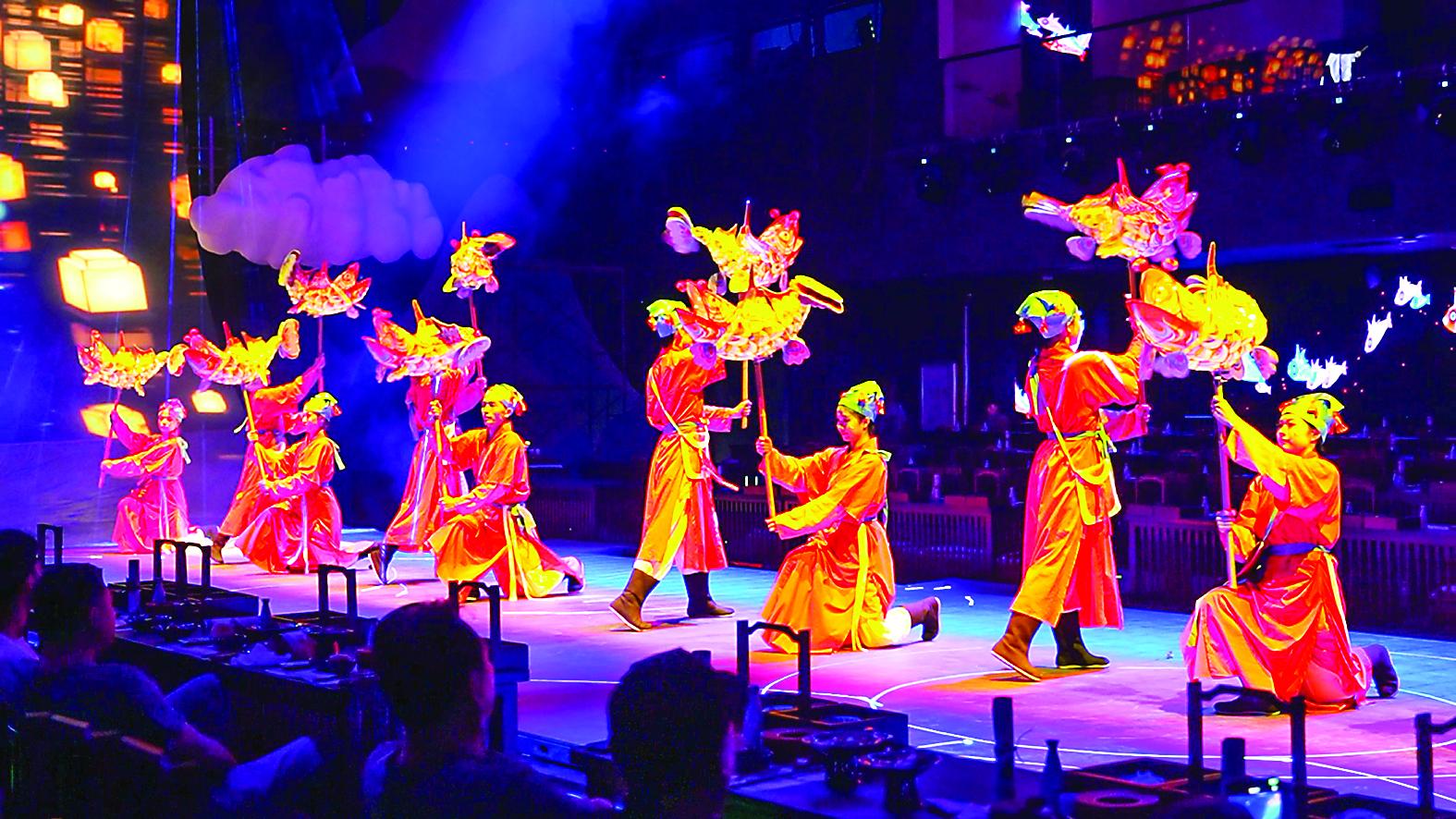 餐秀以宋代美學(xué)為底色,以二十四節(jié)氣為敘事線索,分“春生”“夏華”“秋思”“冬溯”四幕展開?!按荷蹦粏ⅲ枵呱碇G宋裝,指尖模擬北苑茶山采茶動作,背景大屏同步流轉(zhuǎn)建甌春季竹海云霧;“秋思”時分,演員手持酒盞穿梭席間,用建甌方言唱誦“建州酒令”,邀賓客猜謎互動,還原南宋夜市的熱鬧;“冬溯”環(huán)節(jié),水墨動畫再現(xiàn)朱熹在建甌著書講學(xué)場景,伴著《觀書有感》的吟誦,茶香漫過餐桌;“夏華”篇章最是動人,省級非遺“弓魚技藝”現(xiàn)場演示——將活魚頭部彎曲、尾部綁扎,舞者圍繞魚簍起舞,講述這門“讓魚離水仍活數(shù)天”的技藝背后,建甌人順應(yīng)自然的生活智慧。