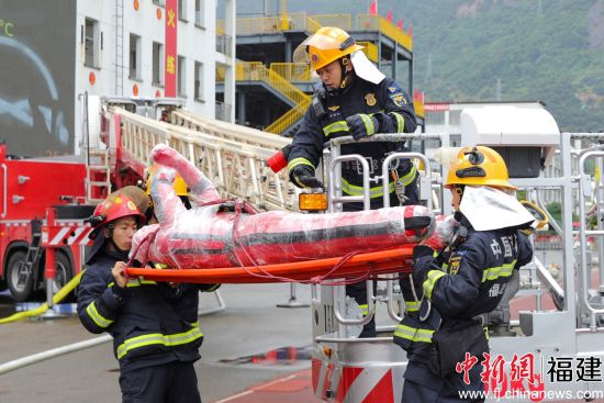 10月21日,在2025年福建省消防救援隊伍崗位練兵“龍虎榜”比武競賽現(xiàn)場,消防員在“高層建筑火災撲救”項目中使用云梯車轉(zhuǎn)運“被困人員”。鄭振盛 攝