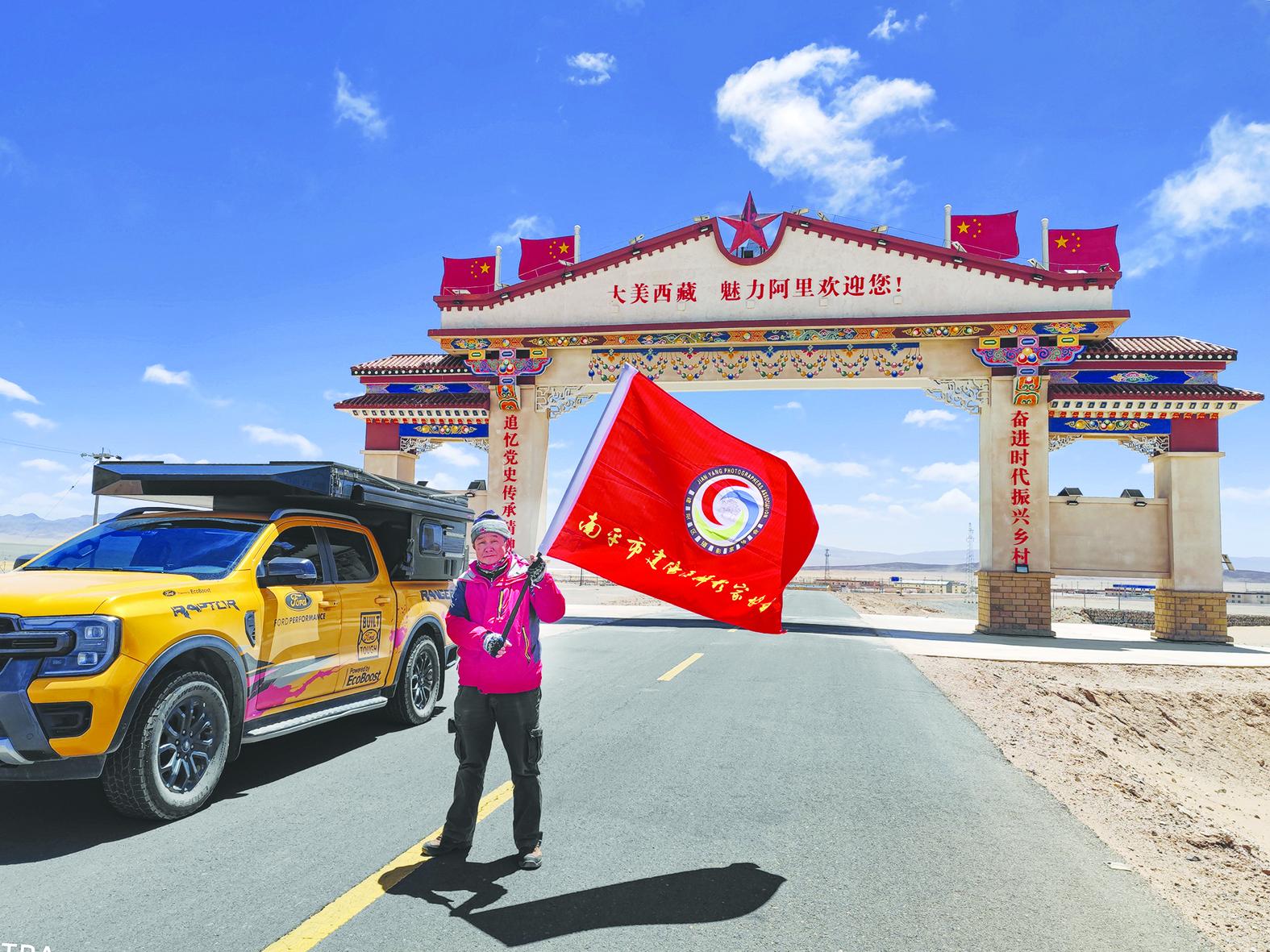 鄭惠平與朋友自駕到西藏。圖為阿里地區(qū)G216國道入口處。 (羅貞洪 攝)