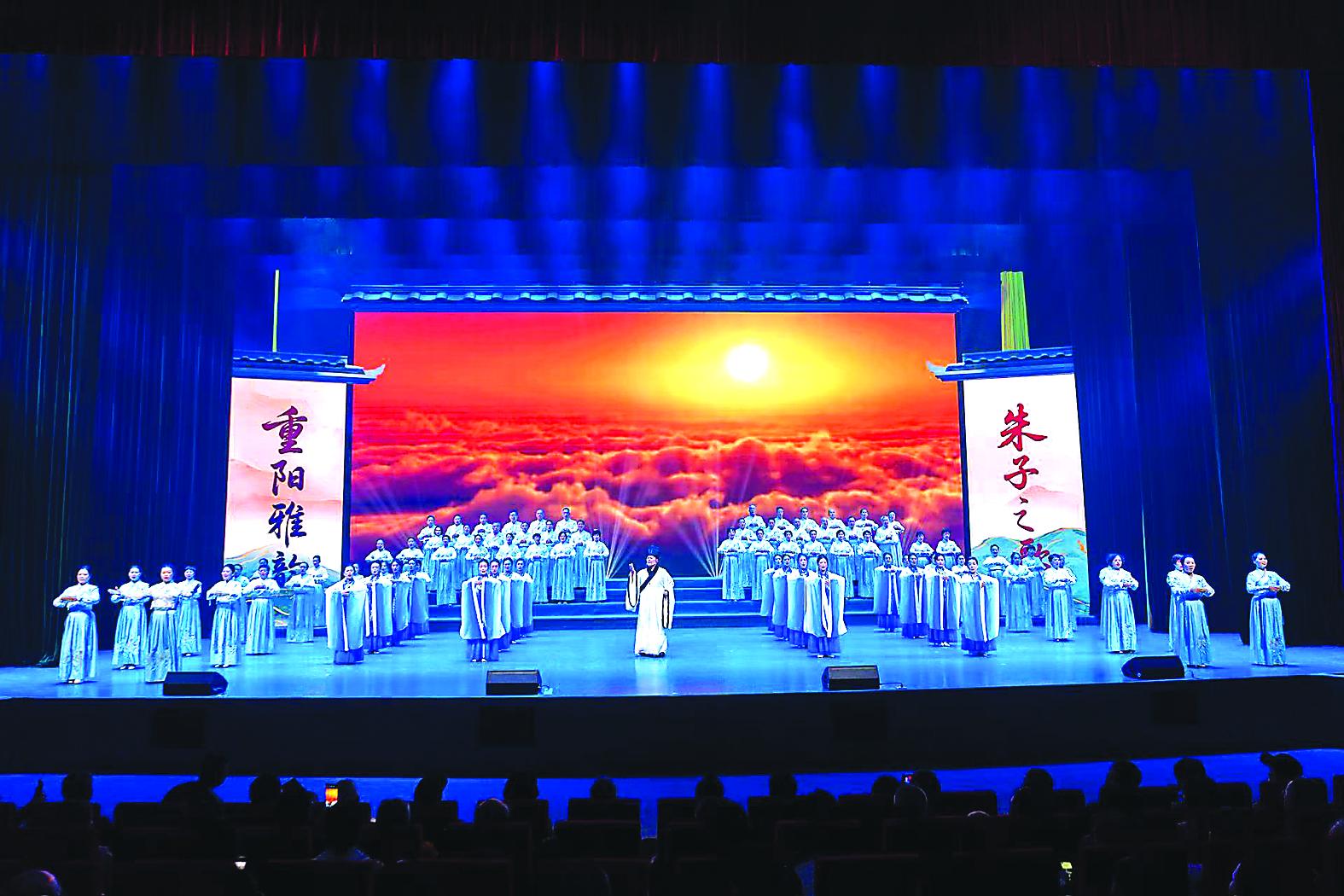 金秋重陽(yáng),雅韻傳揚(yáng)。28日,由省委文明辦主辦,市委老干部局、市委文明辦、市老年大學(xué)承辦的“朱子之歌·重陽(yáng)雅韻”——南平市離退休干部傳承弘揚(yáng)優(yōu)秀傳統(tǒng)文化文藝晚會(huì)在市老年教育文體活動(dòng)中心舉辦。全市廣大離退休干部們以詩(shī)樂舞、戲劇、南詞等形式,生動(dòng)演繹朱子文化思想精髓,展現(xiàn)了新時(shí)代老同志的昂揚(yáng)風(fēng)采。圖為演出現(xiàn)場(chǎng)。 (郭璐 攝)