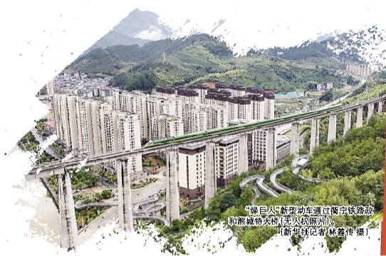 “綠巨人”新型動車通過衢寧鐵路政和熊城特大橋(無人機(jī)照片)。(新華社記者 林善傳 攝)