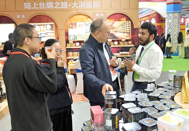 “一帶一路”館里,斯里蘭卡參展商(右一)向客人推薦錫蘭紅茶。(羅光耀 攝)