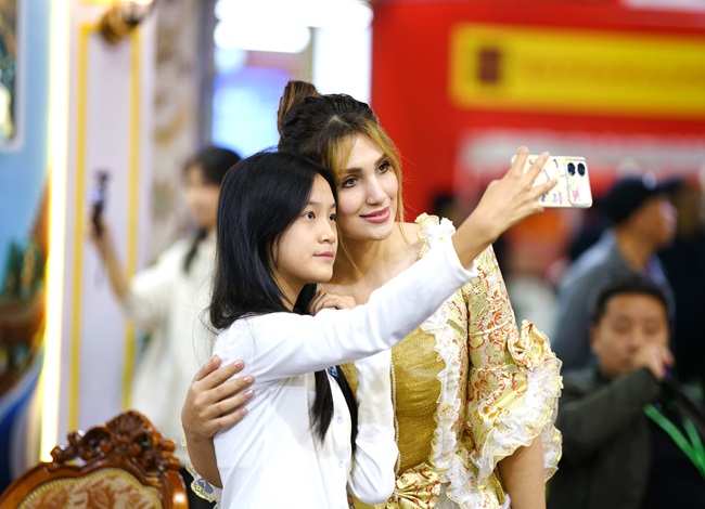 俄羅斯館里,游客與俄羅斯姑娘合影。 (鄭金富 攝)
