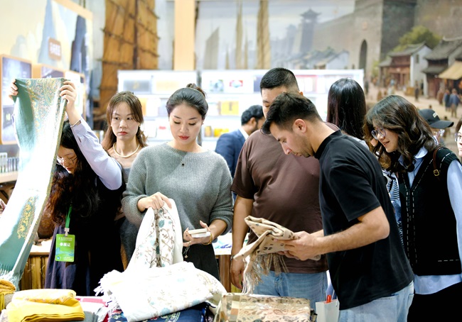 “一帶一路”館里,游客在選購來自阿富汗的羊毛圍巾。 (鄭金富 攝)