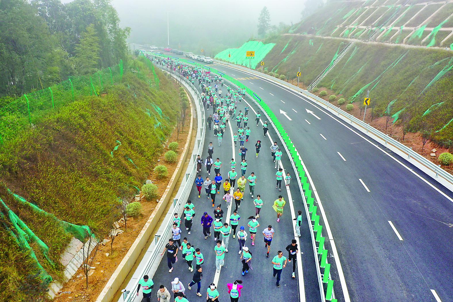 11月16日上午,由南平市體育局、順昌縣政府、福建省旅游發(fā)展集團有限公司指導(dǎo),福建旅發(fā)景區(qū)運營管理有限公司、福建高速經(jīng)營開發(fā)公司聯(lián)合主辦的“2025大圣祖地?福建高速第一跑”,在順昌縣派溪富金湖收費站開跑。賽事設(shè)4公里體驗組與20公里精英組,全國各地800余名跑者在即將通車的沙南高速上沉浸式感受當(dāng)?shù)亟煌òl(fā)展成就與文化魅力。圖為跑者在高速上盡情奔跑。 (朱城鋮 朱宇 攝)