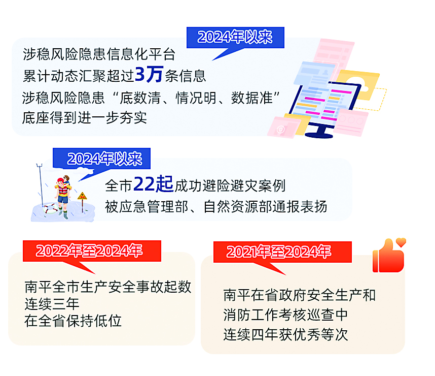 企業(yè)主體責(zé)任有效壓實(shí),精準(zhǔn)化風(fēng)險(xiǎn)管控穩(wěn)步實(shí)施,專(zhuān)業(yè)化監(jiān)管能力顯著提升,2022年至2024年,南平全市生產(chǎn)安全事故起數(shù)連續(xù)三年在全省保持低位,2021年至2024年,南平在省政府安全生產(chǎn)和消防工作考核巡查中連續(xù)四年獲優(yōu)秀等次。