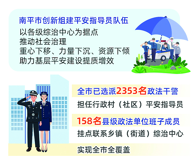 此外,南平市還創(chuàng)新組建平安指導(dǎo)員隊(duì)伍,以各級(jí)綜治中心為據(jù)點(diǎn),推動(dòng)社會(huì)治理重心下移、力量下沉、資源下傾,助力基層平安建設(shè)提質(zhì)增效。目前,南平市已選派2353名政法干警擔(dān)任行政村(社區(qū))平安指導(dǎo)員,158名縣級(jí)政法單位班子成員掛點(diǎn)聯(lián)系鄉(xiāng)鎮(zhèn)(街道)綜治中心,實(shí)現(xiàn)全市全覆蓋。