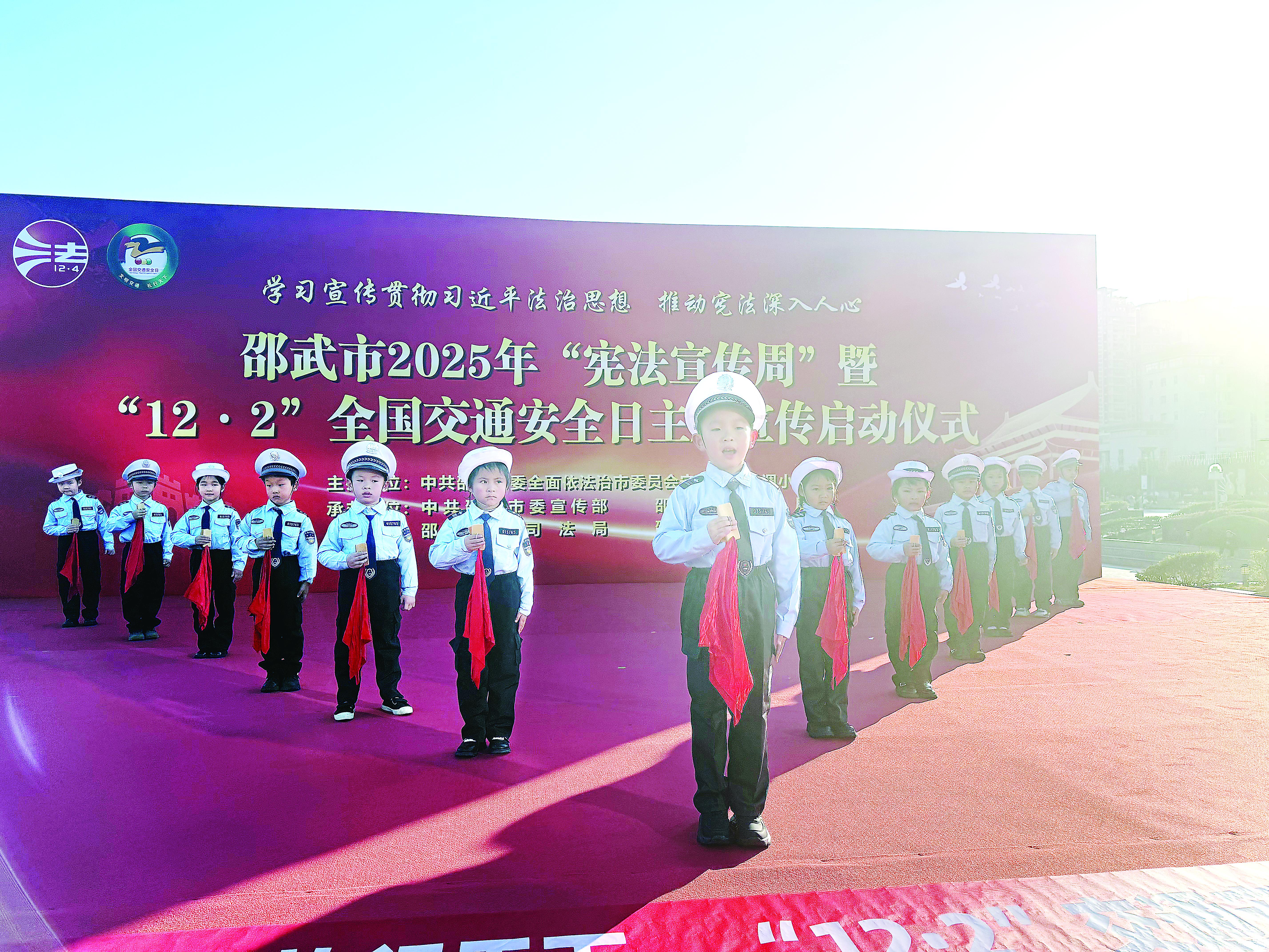 12月1日,邵武市舉行2025年“憲法宣傳周”暨“12·2”全國交通安全日主題宣傳啟動儀式,圍繞活動主題,現(xiàn)場開展了豐富多彩的宣傳互動。圖為邵武水北幼兒園的小朋友們表演快板《文明交通拍手謠》。(黃義清 攝)