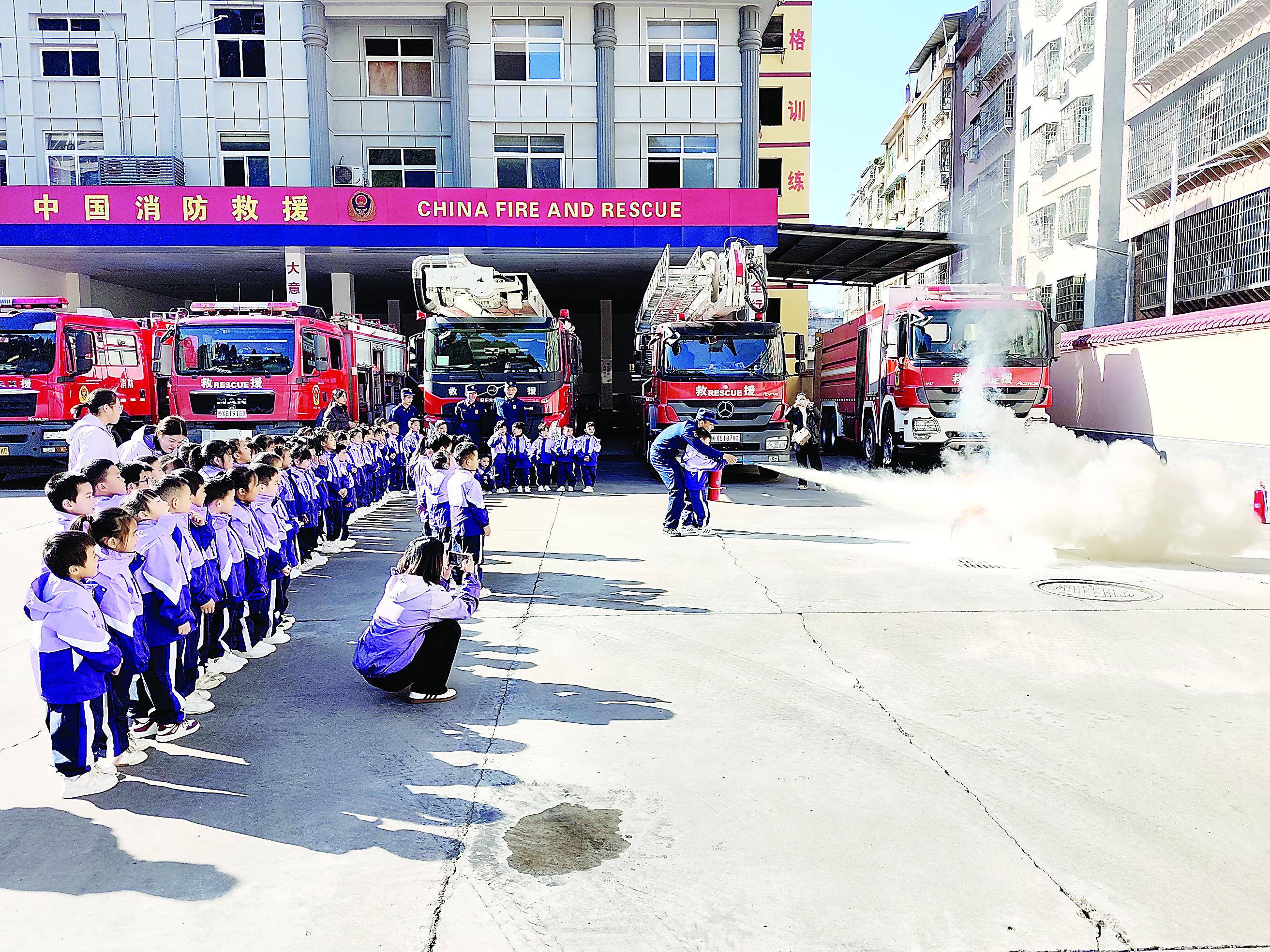 11月28日,政和縣春苗幼兒園80余名師生來到縣消防救援大隊(duì)營區(qū),通過參觀消防器材裝備、體驗(yàn)穿著消防救援服裝、使用滅火器滅火等方式,學(xué)習(xí)消防基礎(chǔ)技能。圖為消防員指導(dǎo)小朋友使用滅火器。 (邵康有 攝)