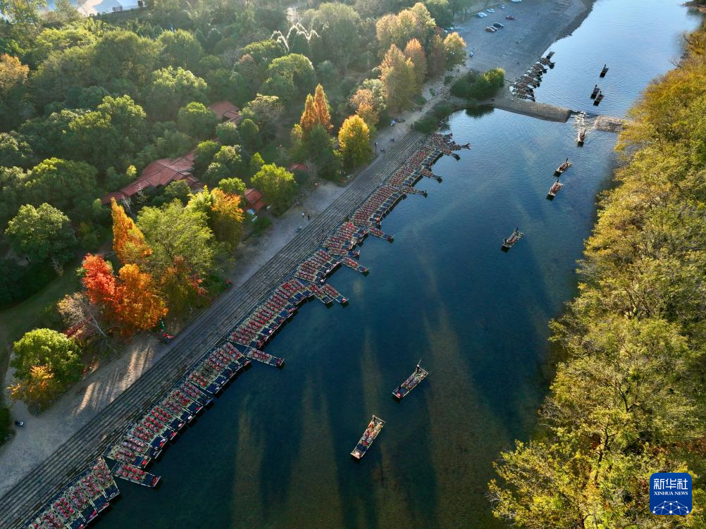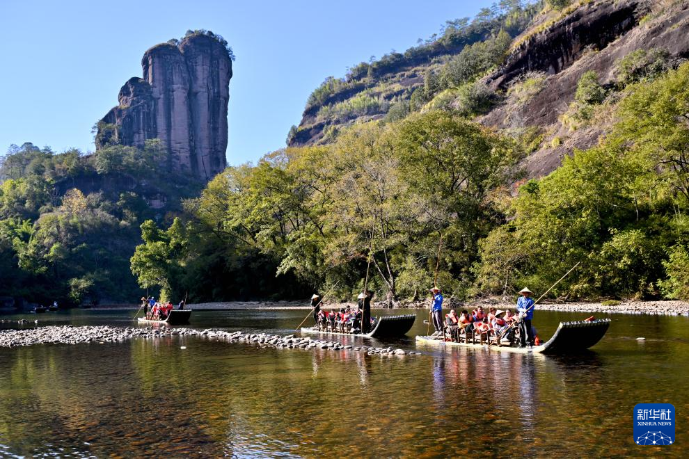 近日,福建武夷山天藍(lán)水碧,綠水青山中色彩斑斕的楓樹、水杉等林木點(diǎn)綴其間,呈現(xiàn)別樣的冬日景致,吸引游客前來旅游休閑。(新華社記者 姜克紅 攝)