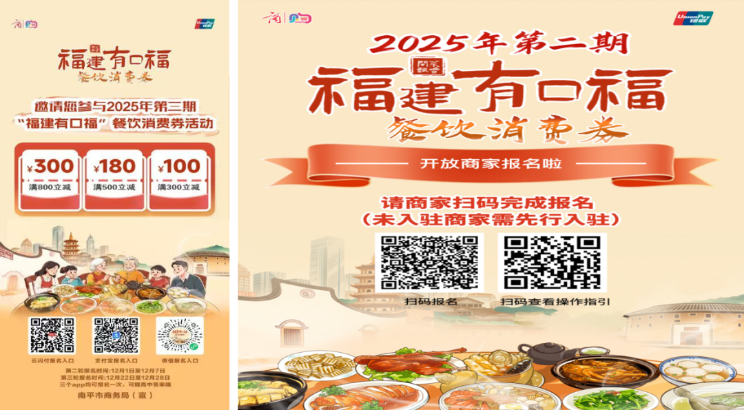 同時(shí),現(xiàn)場(chǎng)推介了2025年“福建有口?!辈惋嬒M(fèi)券活動(dòng),推出滿(mǎn)300元減100元、滿(mǎn)500元減180元、滿(mǎn)800元減300元三檔優(yōu)惠,通過(guò)云閃付、支付寶、微信平臺(tái)分三輪發(fā)放,鼓勵(lì)游客品嘗地道閩北風(fēng)味。