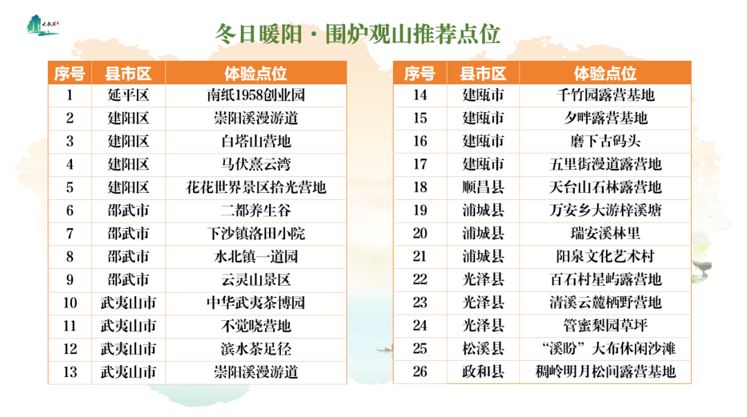 活動(dòng)現(xiàn)場(chǎng),南平市文旅部門(mén)整合全域精品資源,重磅推出了25個(gè)“冬日暖陽(yáng)·圍爐觀山”推薦點(diǎn)位,涵蓋崇陽(yáng)溪漫游道、南紙1958創(chuàng)業(yè)園、稠嶺明月松間露營(yíng)基地等體驗(yàn)點(diǎn);推出了10個(gè)冬日暖陽(yáng)·最美風(fēng)景打卡點(diǎn)位,有江星公路水杉路、高星公路水杉路、茶平鄉(xiāng)柳杉大道、天臺(tái)山銀杏林、大嶺銀杏群等初冬限定美景,為廣大游客送上了一份干貨滿(mǎn)滿(mǎn)的冬日山水漫游攻略。