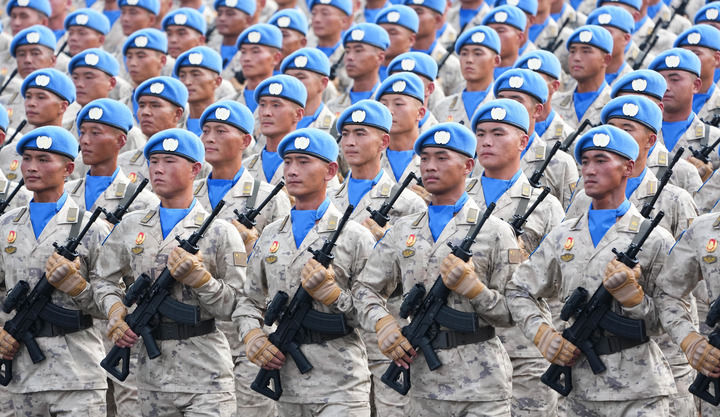 ??維和部隊(duì)方隊(duì)官兵頭戴藍(lán)色貝雷帽、脖系藍(lán)色絲巾,目光如炬、步履堅(jiān)定走過天安門廣場(chǎng)。