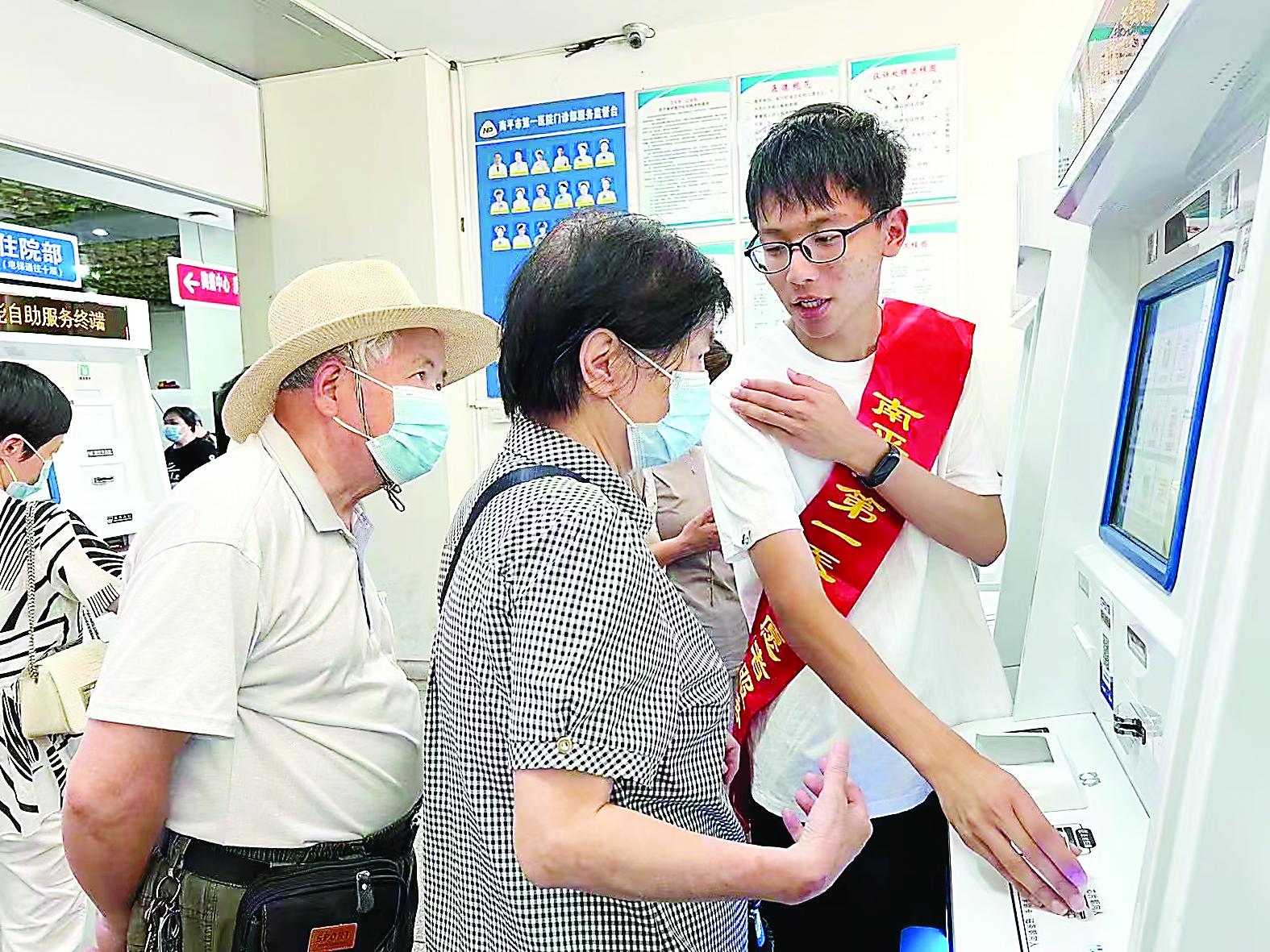 返鄉(xiāng)大學(xué)生志愿者為患者及家屬提供自助機(jī)服務(wù)指導(dǎo)等志愿服務(wù)。