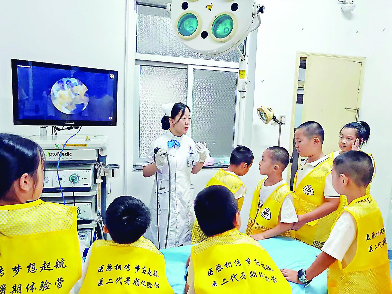 “醫(yī)二代”暑期體驗(yàn)營,孩子們在門診耳鼻喉頭頸外科參觀。