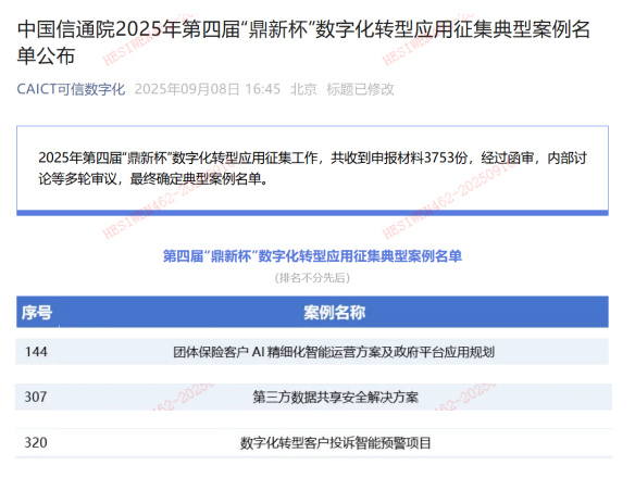 近日,中國信息通信研究院正式公布2025年第四屆"鼎新杯"數(shù)字化轉(zhuǎn)型應(yīng)用征集典型案例名單。平安產(chǎn)險報送的《團體保險客戶AI精細化智能運營方案及政府平臺應(yīng)用規(guī)劃》、《數(shù)字化轉(zhuǎn)型客戶投訴智能預(yù)警項目》和《第三方數(shù)據(jù)共享安全解決方案》三項實踐從全國3753份申報案例中脫穎而出,成功入選典型案例名單,標志著公司在保險科技領(lǐng)域的數(shù)字化轉(zhuǎn)型創(chuàng)新成果獲得國家權(quán)威機構(gòu)與行業(yè)專家的高度認可。
