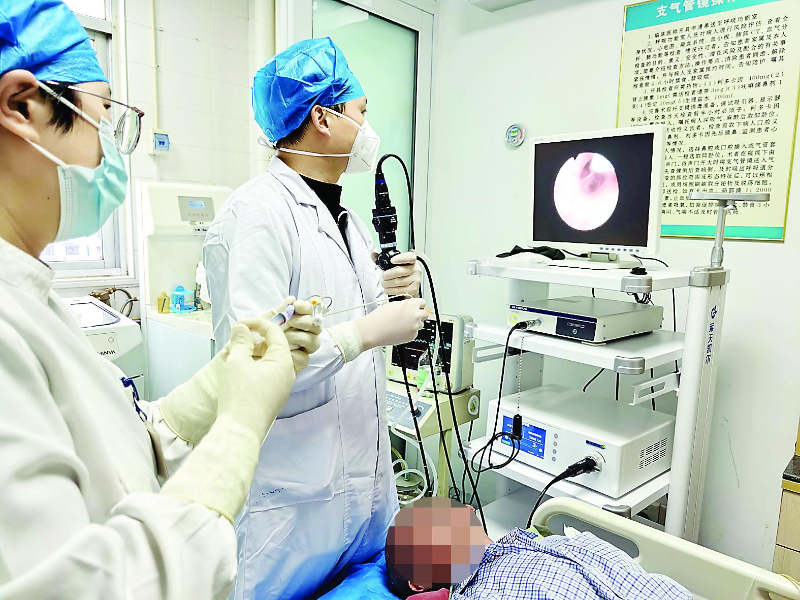 南平市人民醫(yī)院肺病科主任吳慧毅(右)在為患者做氣管鏡