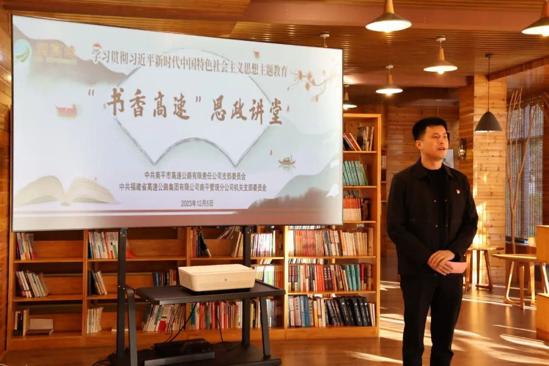 在南平管理分公司紫薇書社,雙方支部共同開展學(xué)習(xí)貫徹習(xí)近平新時代中國特色社會主義思想主題教育暨“書香高速”思政講堂活動,雙方各派出兩組代表分別圍繞“綠水青山就是金山銀山”、 “新時代中國特色社會主義文化建設(shè)”、“立足崗位講奉獻(xiàn),擔(dān)當(dāng)作為勇創(chuàng)新”、“‘茶廉’文化”等主題分享感悟交流心得,在一位位演講者聲情并茂的演說下,讓在場的每一位黨員都如臨其境,深刻體會到要切實(shí)把習(xí)近平新時代中國特色社會主義思想轉(zhuǎn)化為堅(jiān)定理想、錘煉黨性、指導(dǎo)實(shí)踐、推動工作的強(qiáng)大力量,堅(jiān)持勇于自我革命精神,用實(shí)際行動推動企業(yè)高質(zhì)量發(fā)展。