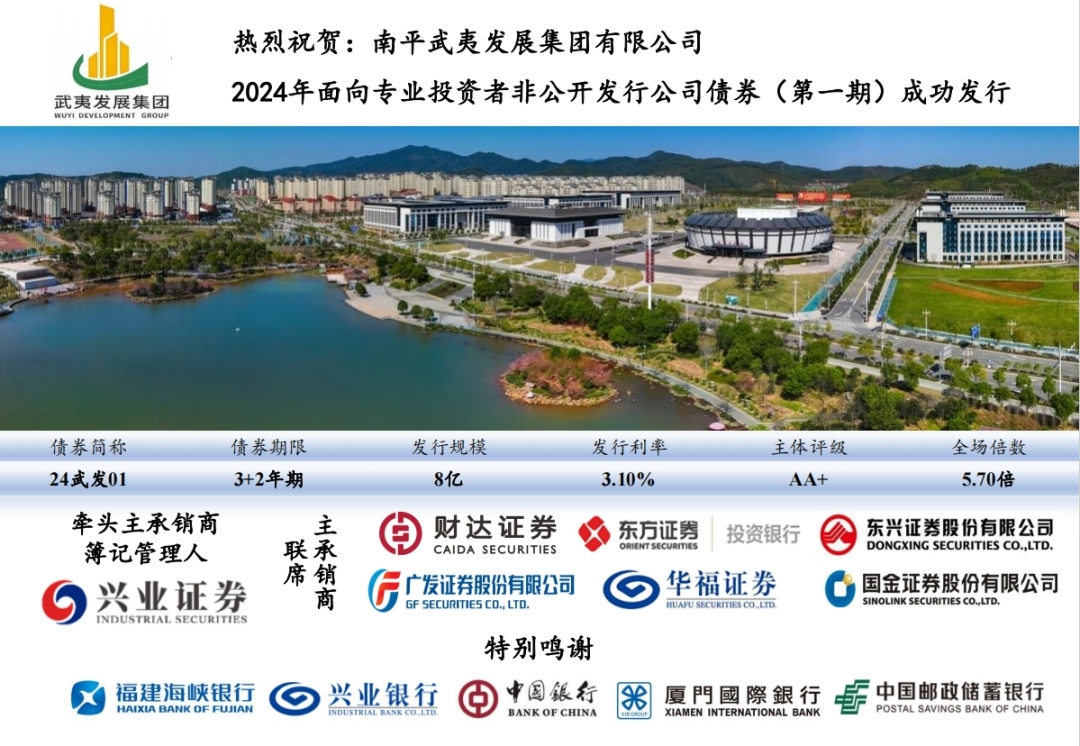 1月9日,南平武夷發(fā)展集團(tuán)有限公司2024年面向?qū)I(yè)投資者非公開發(fā)行公司債券(第一期)(債券簡稱:24武發(fā)01,債券代碼:253489.SH)在上海證券交易所成功簿記發(fā)行,發(fā)行規(guī)模8億元,期限3+2年,票面利率3.10%。本次債券由興業(yè)證券擔(dān)任牽頭主承銷商,財(cái)達(dá)證券、東方投行、東興證券、廣發(fā)證券、華福證券、國金證券擔(dān)任聯(lián)席主承銷商。