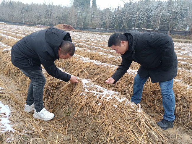 鎮(zhèn)黨委副書記陳惠明副書記帶領(lǐng)農(nóng)技員在朱坊村察看竹蓀種植防寒防凍工作。