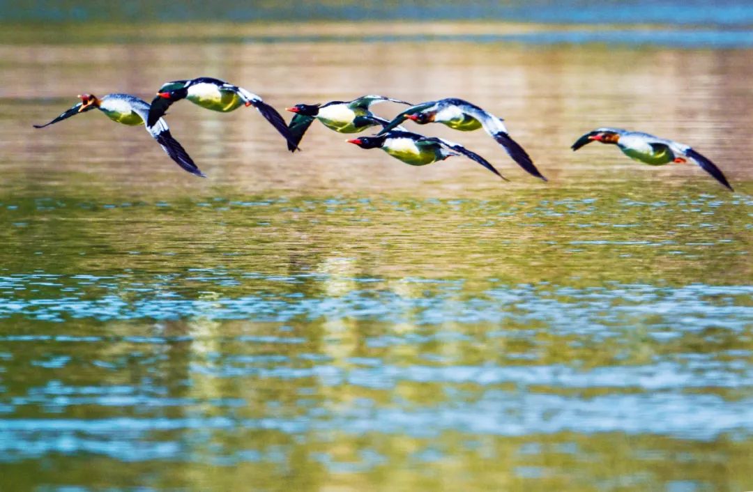 一群中華秋沙鴨從水面飛過。中華秋沙鴨是國(guó)家一級(jí)重點(diǎn)保護(hù)動(dòng)物,被列入《世界自然保護(hù)聯(lián)盟瀕危物種紅色名錄》,有鳥類“活化石”“鳥中大熊貓”。(鄭金富 羅光耀 攝)