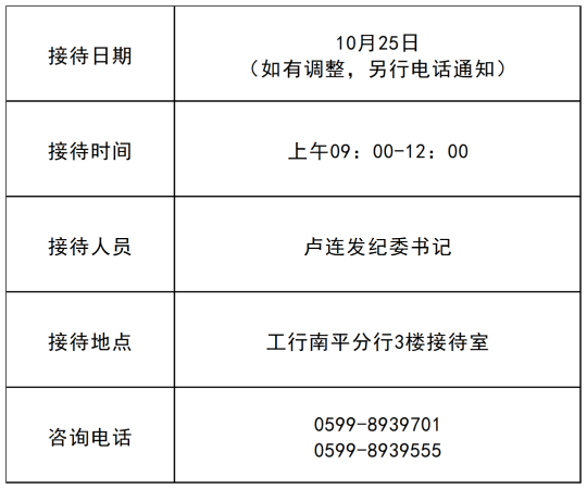 中國工商銀行南平分行2024年10月"行長接待日"公告