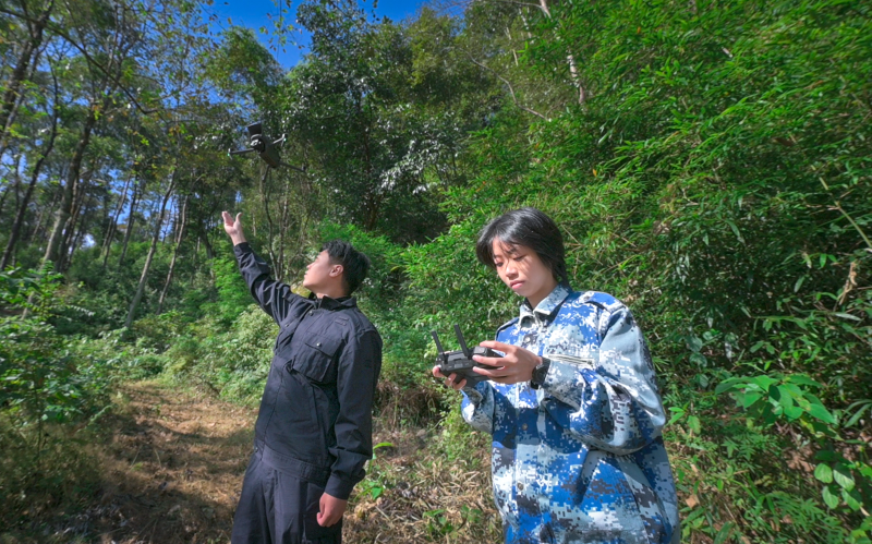 護(hù)林工作人員用無(wú)人機(jī)巡視森林。