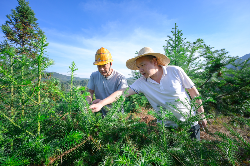 技術(shù)人員察看杉木的生長(zhǎng)情況。