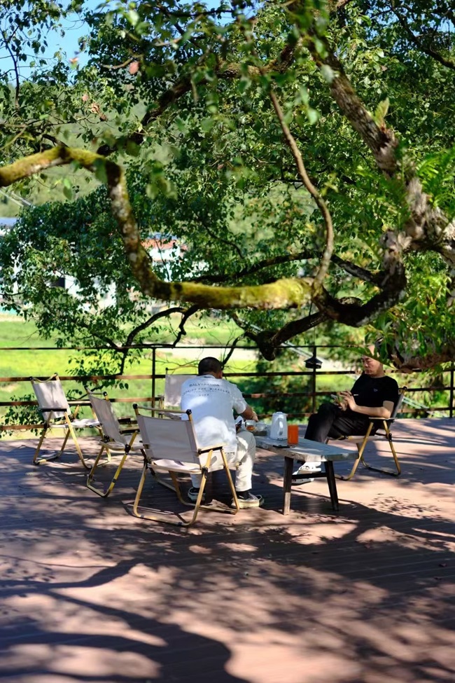 民宿內(nèi),游客坐在樹下享受休閑時光。