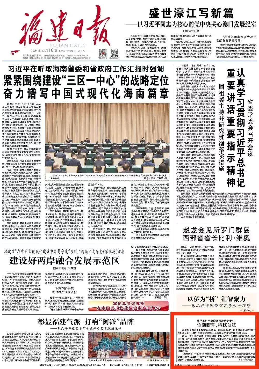 12月18日,《福建日報》頭版、新福建、海博TV、學(xué)習(xí)強國等媒體平臺刊發(fā)《南平市竹產(chǎn)業(yè)設(shè)計制造檢測中心:竹韻新章,科技領(lǐng)航》文章,專題報道南平市科技局、武夷學(xué)院、福建省竹產(chǎn)業(yè)工業(yè)設(shè)計研究院等單位共同組建的南平市竹產(chǎn)業(yè)設(shè)計制造檢測中心,聚焦竹產(chǎn)業(yè)的關(guān)鍵科學(xué)問題與技術(shù)需求,展開技術(shù)攻堅與成果轉(zhuǎn)化,為竹企發(fā)展全方位賦能,引領(lǐng)竹產(chǎn)業(yè)實現(xiàn)轉(zhuǎn)型升級的進展成效。