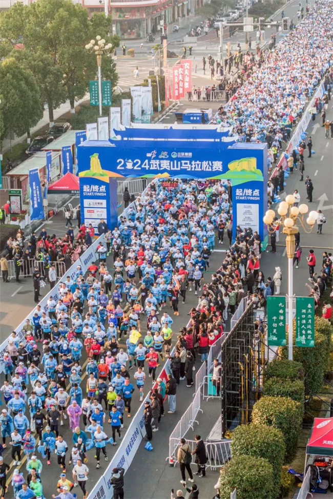 2024 武夷山馬拉松賽激情開(kāi)跑,來(lái)自世界8個(gè)國(guó)家和地區(qū)、32個(gè)省級(jí)行政區(qū),156個(gè)城市的1.5萬(wàn)名馬拉松選手共赴“世界茶鄉(xiāng)之約”。(南平市體育局 供圖)